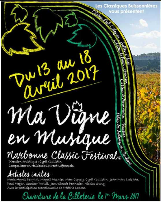 Pour sa seconde édition le Festival " Ma vigne en Musique, Narbonne Classic Festival " sort le grand jeu. Au coeur du plus grand vignoble du monde et des massifs remarquables protégés, à Narbonne première fille de Rome, et sur le territoire de la Clape, Cyril Guillotin pianiste-concertiste et directeur artistique a concocté une programmation exceptionnelle pour ce festival de musique classique. Alternant de grands spectacles au coeur de la merveilleuse cité de Narbonne, ville d'art et d'histoire avec son prestigieux ensemble du Palais des Archevêques, et dans l'écrin de domaines et châteaux viticoles au coeur du Parc Naturel Régional de la Narbonnaise en Méditerranée. Tous les amateurs d'art et de cultures, de nature, de gastronomie et d'œnologie y trouveront leur bonheur. Saveurs multiples, personnalités diverses au grès de concerts, Master Class et conférences produits par de merveilleux artistes au talent reconnu internationalement, tels Marc Coppey, violoncelle, Jean-Marc Luisada, piano, Paul Meyer, clarinette, Magali Mosnier,