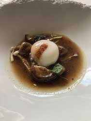 Notons ! Champignons des sous-bois en crus et cuits dans un bouillon clair de Petits Paris au miso, et un œuf crémeux, servi avec le blanc «La Muse» (2021) de la cave Gallician Signature. Le rouge « Les Agapans » (2019) du Domaine de Poulvarel est parfait sur un filet de bœuf mariné au poivre Panniyoor, rôti, un jus clair au foin, accompagné d'une tartelette crémeuse à l'aigrillade, avec haricots « vert et violet » en jus de texture.
